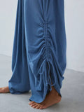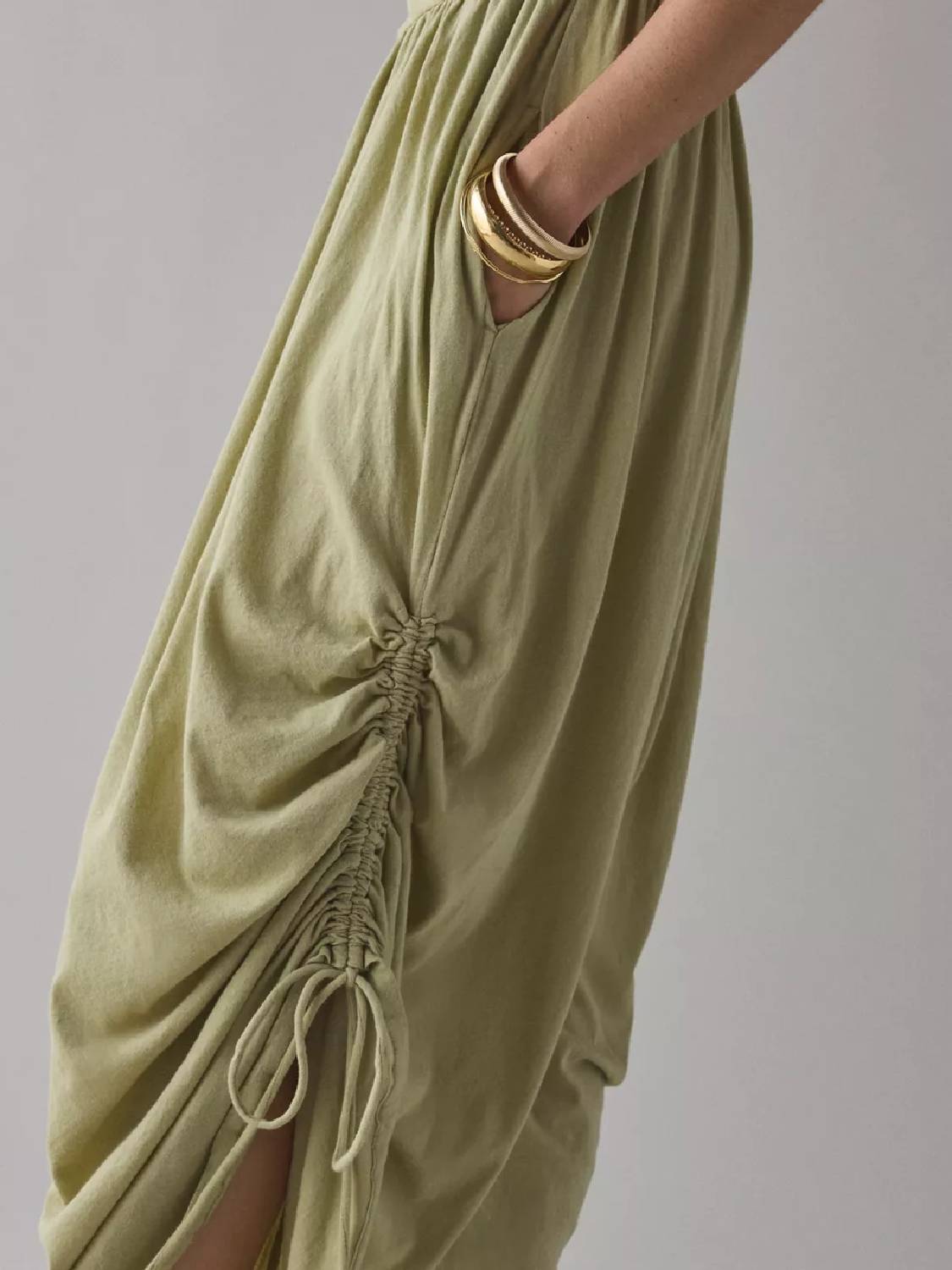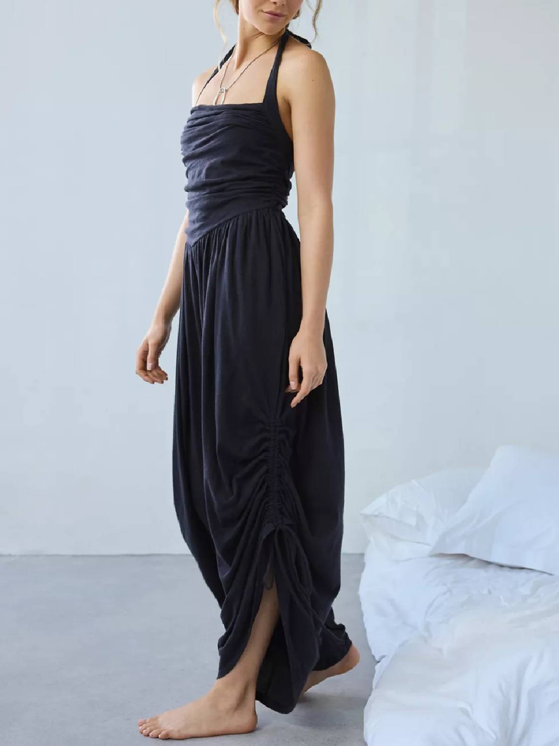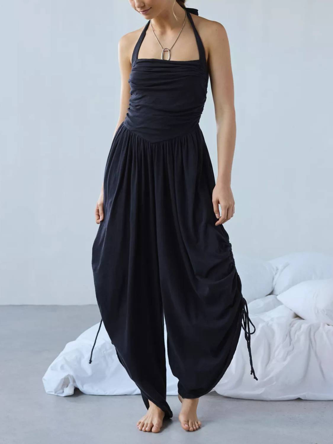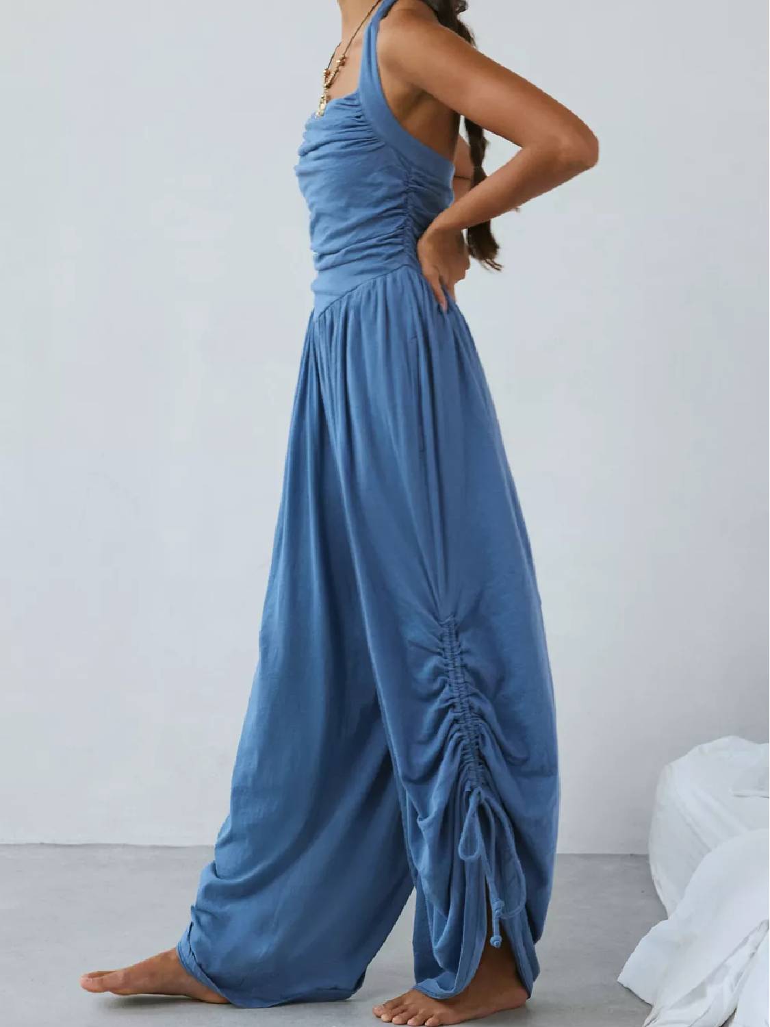 Effortless-cool jumpsuit in a soft, lightweight cotton knit. Features a square neckline, halter straps and a ruched drop-waist bodice. Finished with wide, barrel legs with side-cinch detailing for a personalized look.
