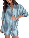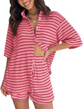 Womens Striped Knit V Neck Button Down Lounge Sets