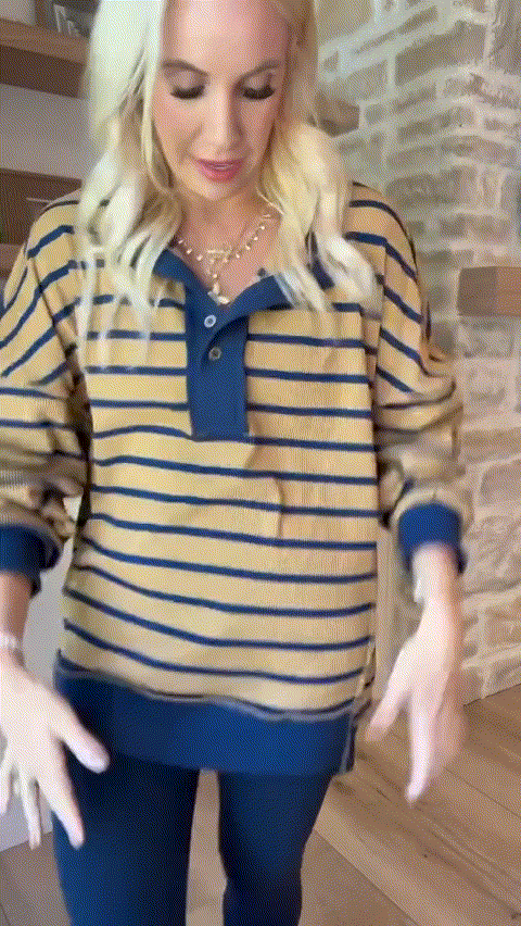 Women's Striped Oversized Button Up Henley Neck Waffle Knit Pullover