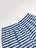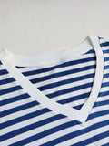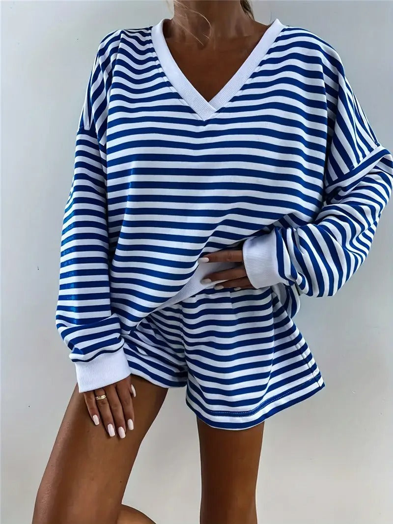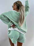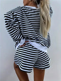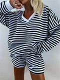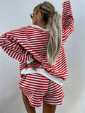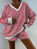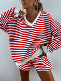 Women's Striped Print Long Sleeve V Neck Sweatshirt and Shorts Set