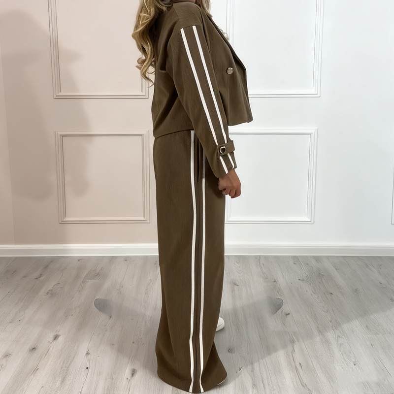 SPORTY-CHIC SIDE STRIPE: A contrasting side stripe detail adds a contemporary, athletic-inspired touch to the classic design. This modern accent elevates the set, making it a fashionable choice for various casual and smart settings.