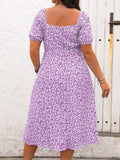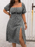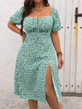 Feel effortlessly beautiful in this boho-chic floral dress! Designed for curves, this flowy midi dress features a flattering square neckline, puff sleeves, and a high slit for just the right touch of elegance and sass. Whether you're strolling on the beach or heading to brunch, this dress is your go-to for a dreamy, feminine look.