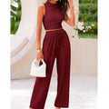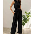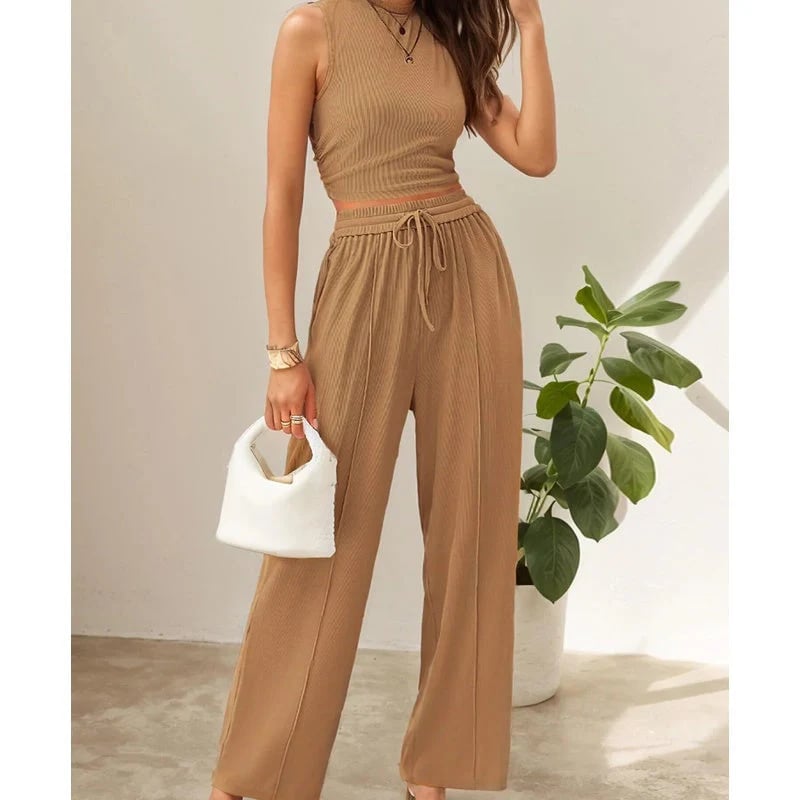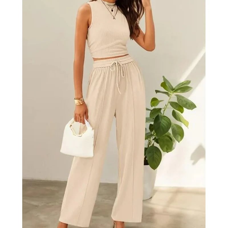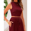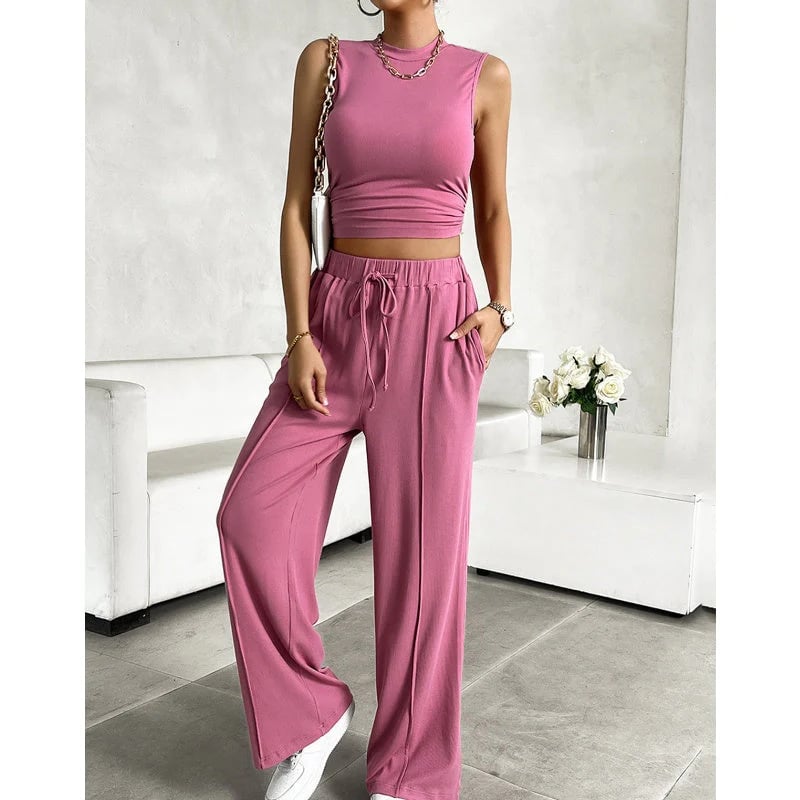 Women's Summer Solid Short Crop Tank Top & Drawstring Wide Leg Pants 2-Piece Set