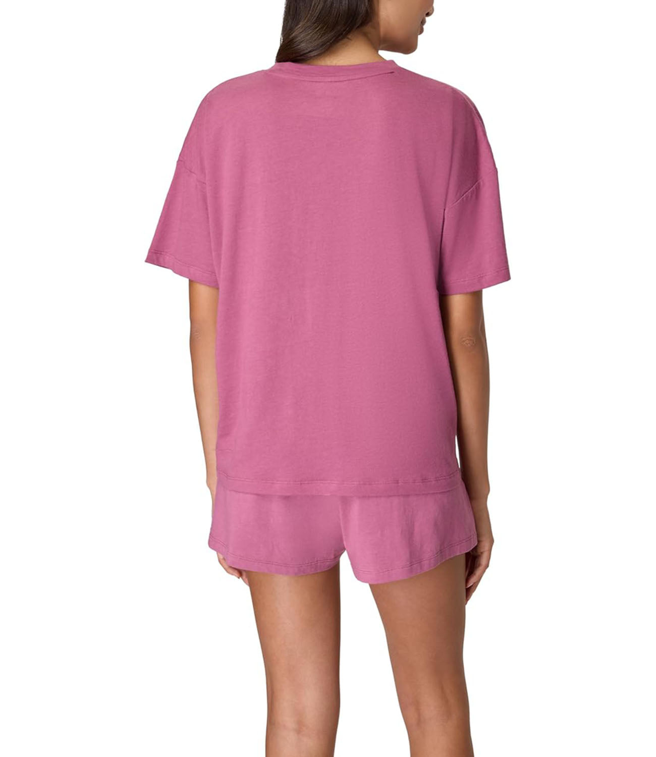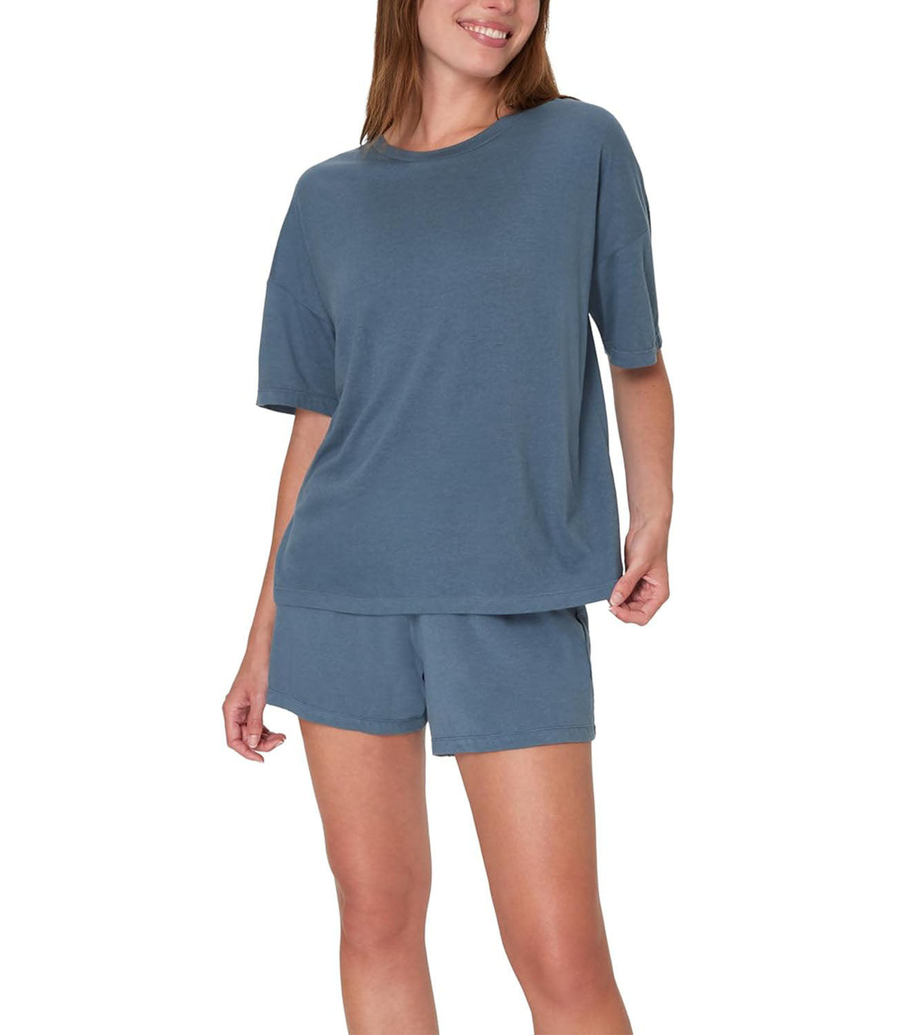 - THE FIT - Boxy T-shirt delivers a roomy, loose fit. Sleep shorts feature a high waist and a 3.25" inseam with a slightly flared leg.