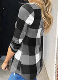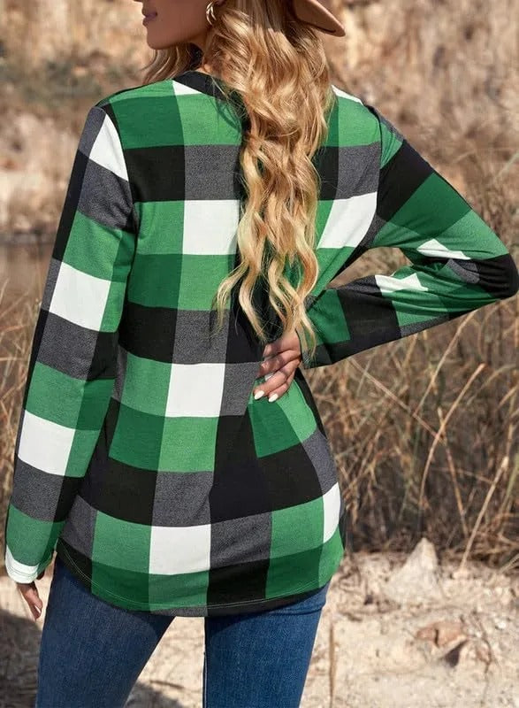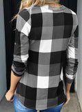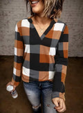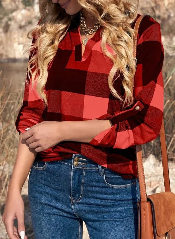 Women's V Neck Plaid Print Cuffed Long Sleeve Shirt