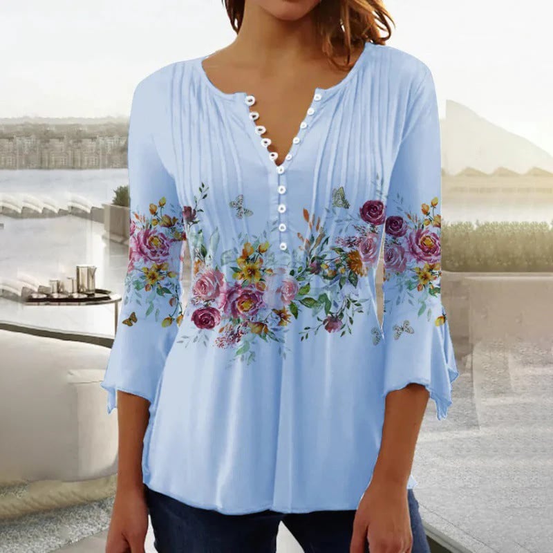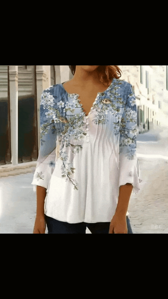 Raise your informal wardrobe with our sleeve shirt 3/4 pleated with v-collar and floral buttons for women. This versatile and elegant T-shirt combines comfort and elegance, making it a perfect complement to your everyday outfits.