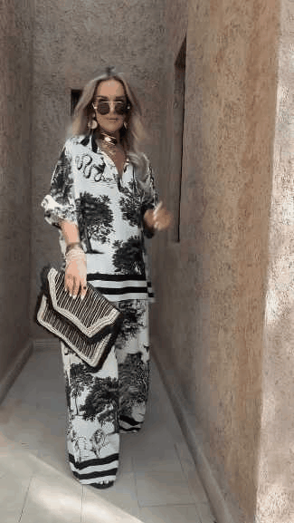 Elevate your everyday style with this Women's V-neck Top and Printed Trousers Casual Suit. Featuring a flattering V-neckline and chic printed trousers, this set offers both comfort and sophistication for any casual occasion.